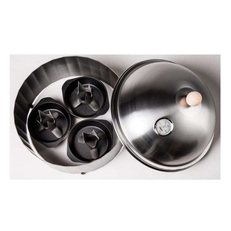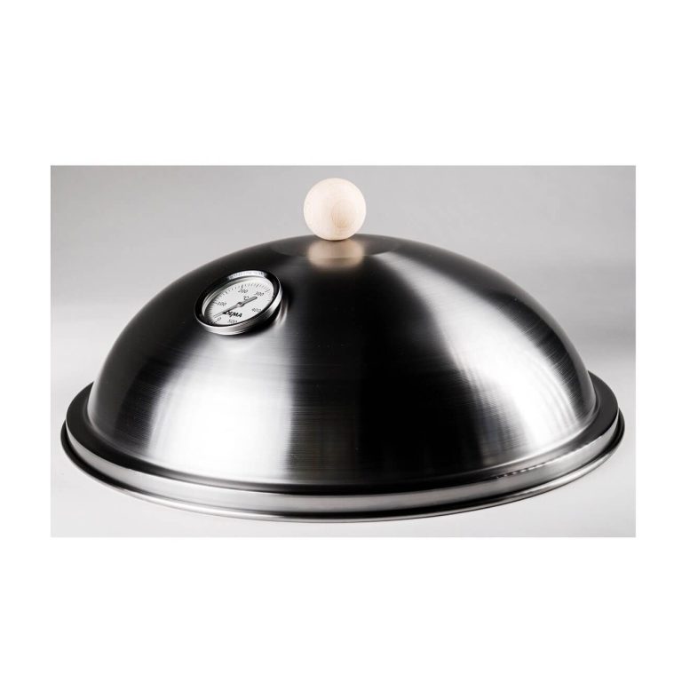 Die Thermohaube ist grundsätzlich Bestandteil des Brat- oder Pizza Sets, kann aber gerne auch separat erworben werden. In Verbindung mit der Mehrzweckkochplatte (Art.-Nr. 026) kann diese z.B. auch zum Smoken verwendet werden.